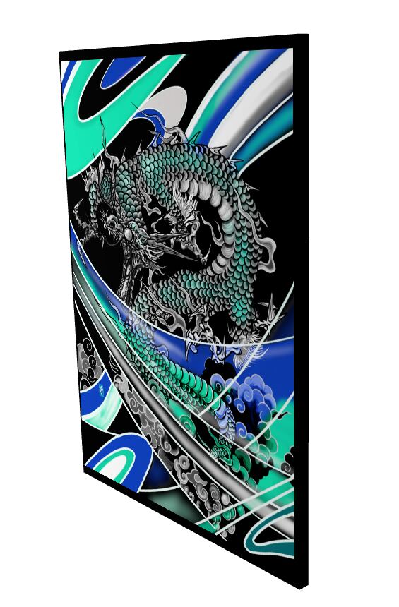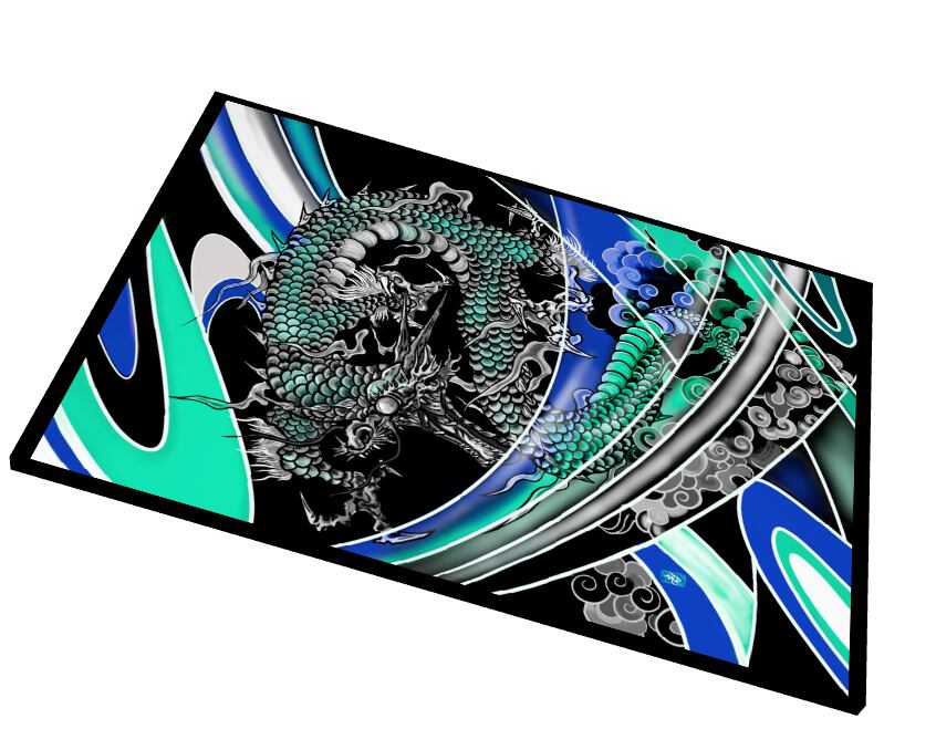 狂い乱れながらも、尚も登ろうとする猛々しい龍を描きました。金色の伝統的な色合いと、水をイメージした青のデザインを制作しました。個人的には青が気に入っています(真羅)