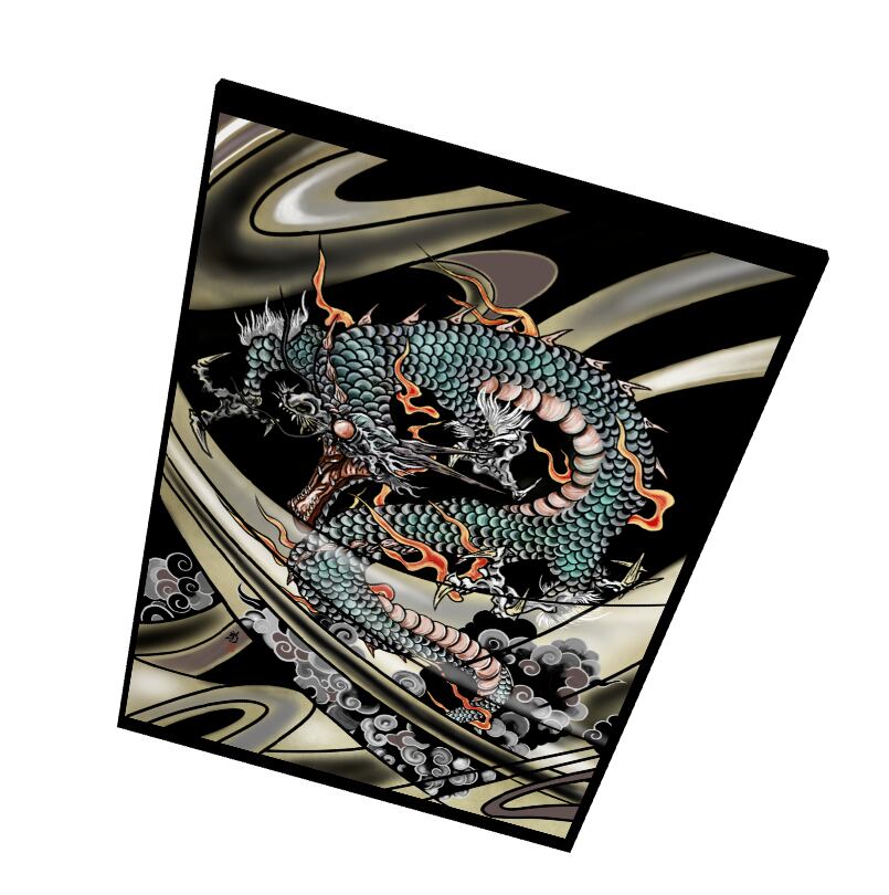 狂い乱れながらも、尚も登ろうとする猛々しい龍を描きました。金色の伝統的な色合いと、水をイメージした青のデザインを制作しました。個人的には青が気に入っています(真羅)